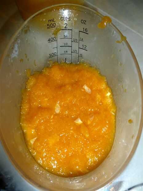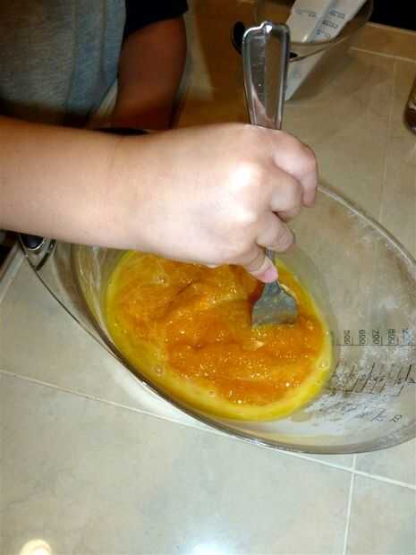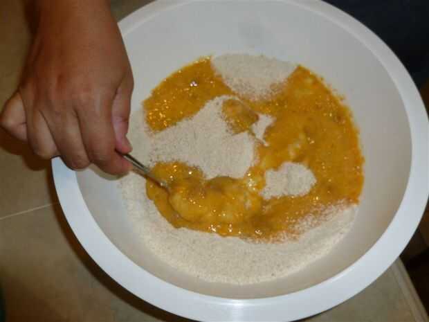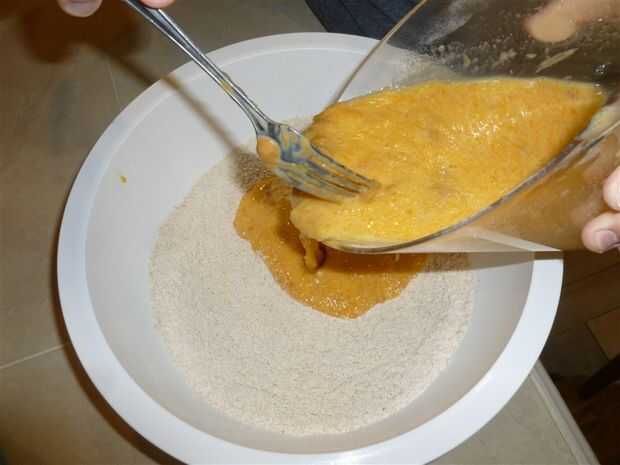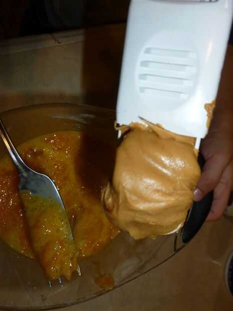 Primero mezclé los ingredientes "húmedos": una taza de puré de calabaza fresca, cuatro huevos y cuatro cucharadas de mantequilla de maní en un recipiente.