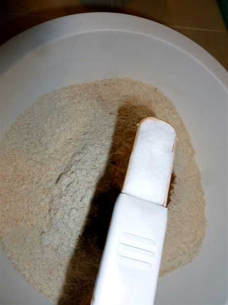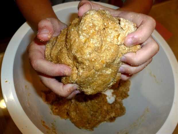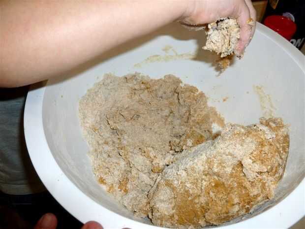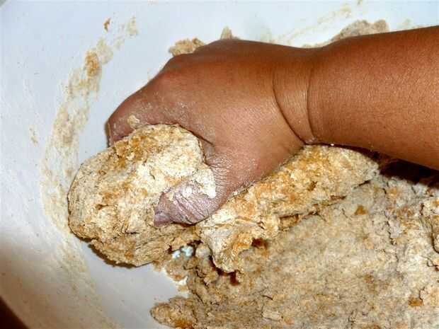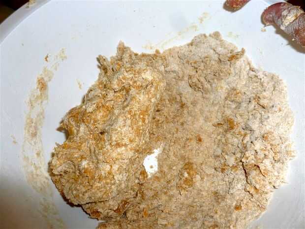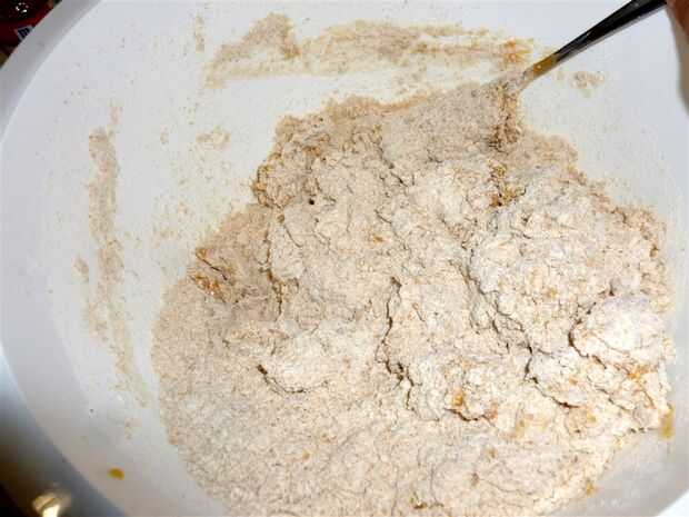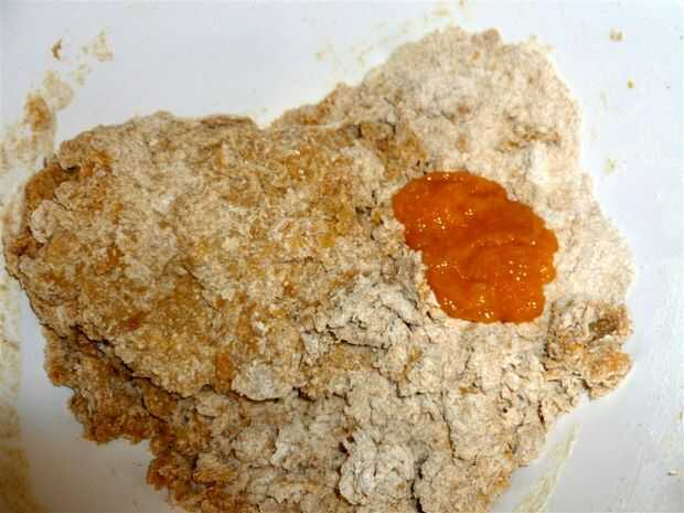 Después de que la masa se mezcló bien con la mano, he añadido dos cucharadas del puré de calabaza reservado en la masa rígida para hacer más viable.