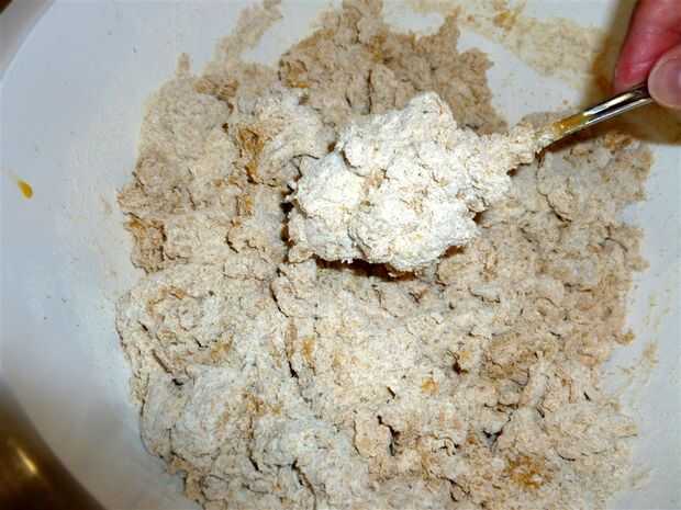 Mezclé los ingredientes húmedos con secos para hacer una masa grumosa.