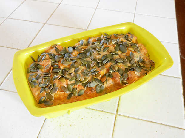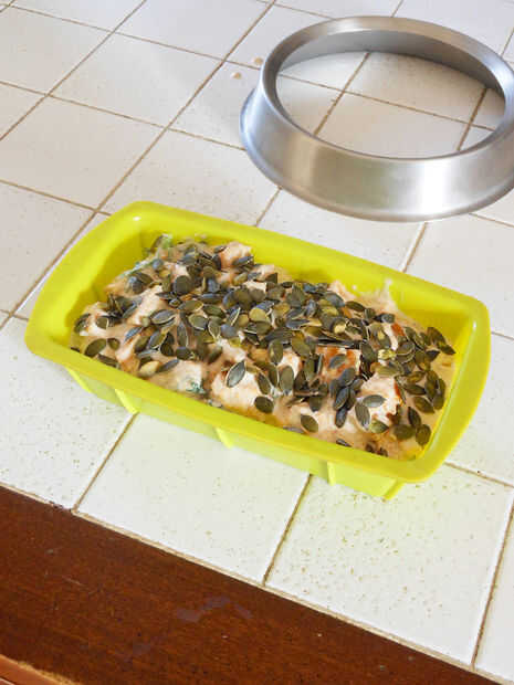 Vierta la mezcla en el molde de la torta y la cubierta con semillas de calabaza.