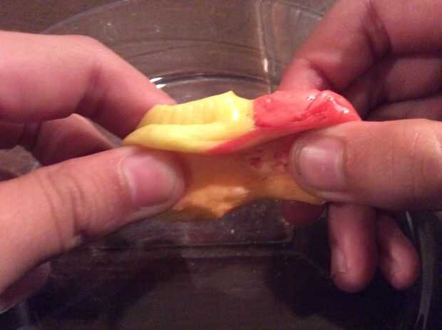 Poner los destellos en un plato de microondas seguro y calentar haciendo dos intervalos, cinco segundos en alta (al menos que de lo que funcionó para mí). Después de eso debe ser fáciles de tirar y puré. Cuando se han mezclado los a lo que te gusta, rodar en un óvalo y pegar un trozo de chocolate en la parte superior.