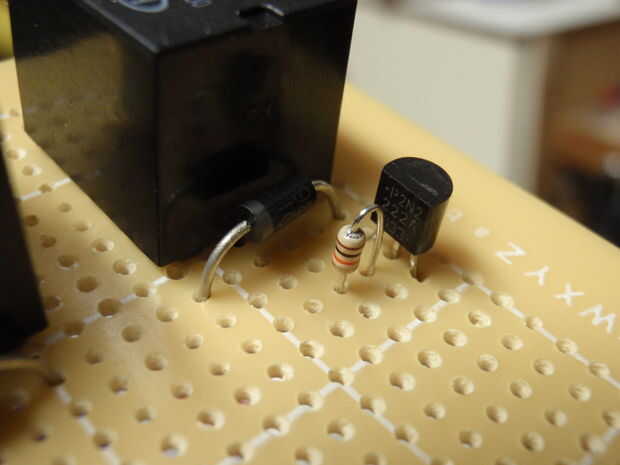 Por ahora las conexiones de soldadura son las siguientes. Relé a la Junta de la soldadura. soldar el diodo para que cada perno es soldar a los pines de señal de relé. Coloque el transistor y soldadura de un pin para el lado negativo del diodo y el relé. La soldadura de la resistencia de 10 k al pin central del transistor. Suelde la resistencia de 330 ohmios para que dos resistencias están conectadas enfrente de ese transistor.
