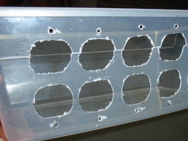 Seleccione una caja de plástico que se adapte a sus necesidades. Usé una caja de tamaño caja de zapatos con tapa. Me dio espacio para las 5 salidas, placa de relé y pequeña caja de plástico para la arduino y el escudo de sonido. Coloque cinta adhesiva sobre el lado que elija para las salidas. Utilizar un enchufe cara placa y traza los agujeros. Ahora utilice el dremel para cortar agujeros.