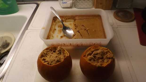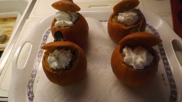 3. Dividir (score) la mezcla de calabaza en 4 porciones y rellenar cada de las cáscaras de calabaza con 1/4 de la morcilla.