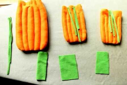 De los tallos, corte uno 5" de 3 1/2", 4 1/2" por 3" y 4" por 2 1/2" del polar verde.  También corte 1/4" tiras perpendiculares al borde de orillo.  Corte de 3 para cada calabaza en diferentes longitudes, ninguno más de la calabaza es alto.  Reservar las tiras.