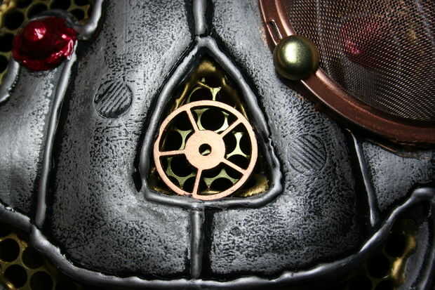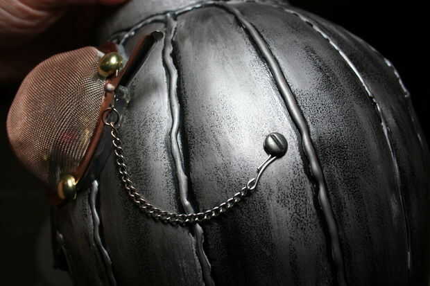 3. pegue el colador de té sobre el ojo de la calabaza. Hacer un agujero en el lado de la calabaza con el cuchillo X-acto. Asegúrese de que el agujero es suficientemente grande para que el brad. Enganche la cadena a la brad e inserte en la calabaza.