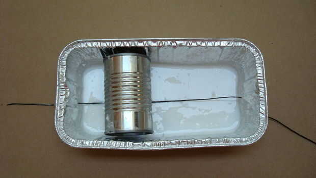 Preparación - perforado un agujero a ambos lados del envase de la lata aproximadamente 1" hacia arriba desde la parte inferior. Ejecute el hilo a través del orificio por un lado, en la mezcla y el otro orificio. Esto me ayudó a ahorrar tiempo y agilizar el proceso. También, este proyecto de arte es desordenado, trabajé en un pedazo grande de cartón, una lona funcionaría muy bien para. Trabajar en cualquier cosa que no va a ser arruinados si tienes pegamento en él.