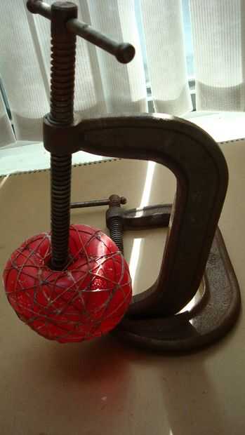 Paso 4 - aplicar alguna vaselina en los extremos de la abrazadera de la abrazadera de "C". Ello, por lo que la cadena empapado de pegamento no se pega a la abrazadera de "C". Inserte el globo envuelto hilo de rosca de la abrazadera de "C", utilice la abrazadera de "C" para conseguir la forma rotunda estuvoo de una calabaza. He usado dos "C" abrazaderas, uno para formar una base para el segundo, por lo que el otro se pare. Ver imagen.