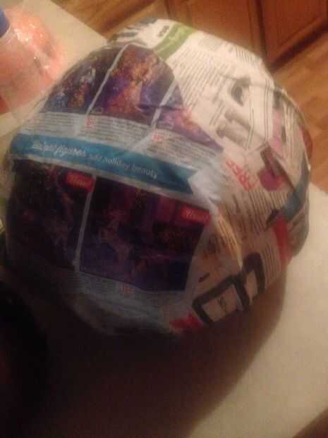 Cubrir el molde con Saran Wrap, cintas hacia abajo. Mezclar 1 taza de harina 1/2 de agua 1 o dos cucharaditas de sal mucho pegamento de Elmer, remojar pedazos de periódico en la mezcla e Inicio pegando de lado a lado o de superior a inferior, más arrugado, más textura tendrá, para cada uno o 2 capas de dejaron totalmente seco, (TIP: mantener un secador muy cerca y en de lo contrario quedo para siempre hasta el final de este proyecto) dejarlo sentarse en una ventana bajo la luz directa del sol y luego deja reposar durante la noche.