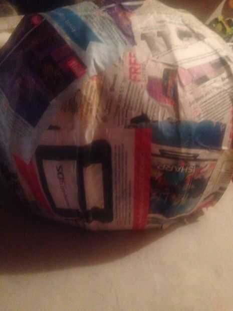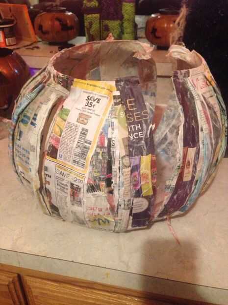 Después de que se seque hacia fuera totalmente, utilice la hoja, y con cuidado cortar alrededor del molde para separar su papel maché del molde real, conducto cinta adhesiva y añadir una capa más de papel maché, todo para sellar todo para arriba, incluyendo la parte superior para formar una calabaza entera como aspecto que