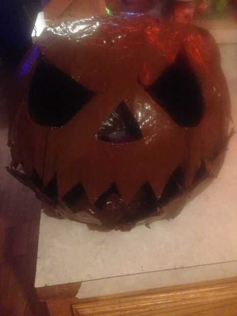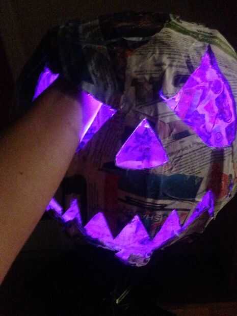 Esta parte suena un poco complicada pero llegar en la boca y saque el papel Saran, si acaba de salir justo, usted puede hacer una abertura en la parte posterior para poner su luz en, o como yo sólo deja todo cerrado y arrojar luz en a través de los ojos, la nariz o la boca :)