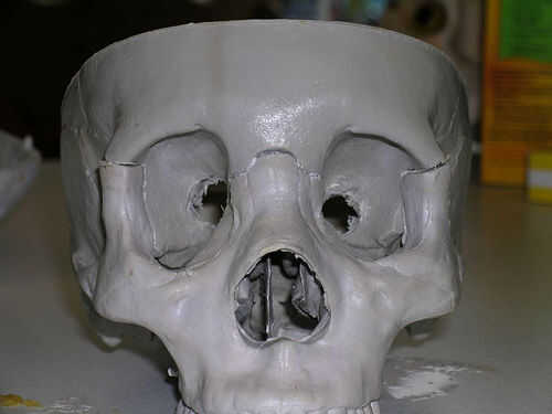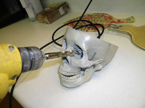 No había una gran abertura entre la cavidad del ojo y la cavidad del cerebro para mí las luces de la secuencia. Usé un poco para proporcionar suficiente espacio para 4 o 5 LEDs de 1/2 pulgada. Tenga mucho cuidado al perforar plástico. Sugiero poner el taladro en reversa y presionando en el lugar hasta que coincida con la punta de la broca. Luego cambiar a beck para adelante y con cuidado quitar poco a poco. Si la broca se cava duro cráneo entero podría empezar spinning y fácilmente podría ocasionarle. Recuerdo esa luz del proyecto de LEDs mejor desde el extremo así que su orificio deben estar alineados para iluminar por detrás el mármol. Quitar el hardware - los resortes y tornillos si desea que la boca del cráneo abierto.