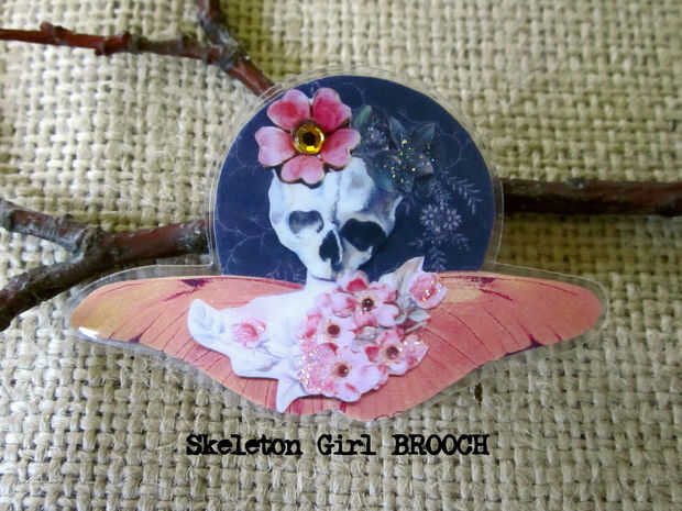 Llamo a este "skellie" mi "niña de la calavera con flores de cerezo". Ella tiene alas de mariposa naranja y adornada con flores de cerezo. Usé una impresión de alta calidad de mi collage original para el broche. Era calor laminado con la película de laminación pesado 7 ml.