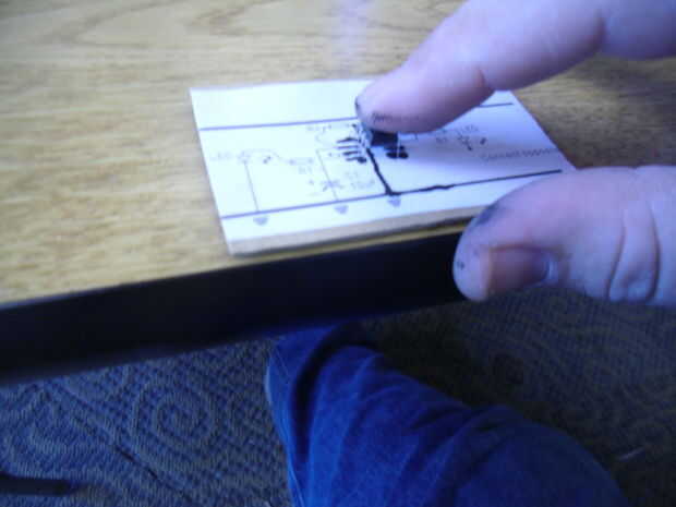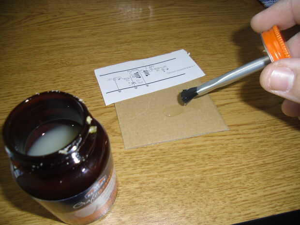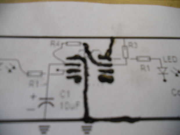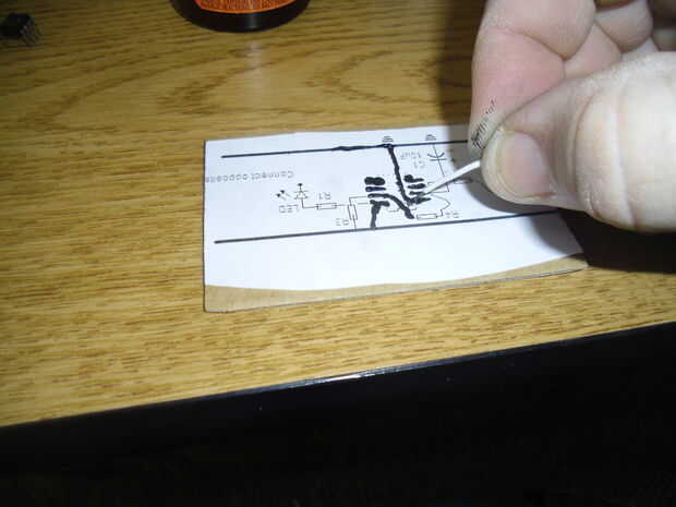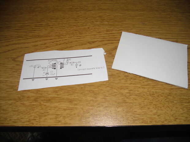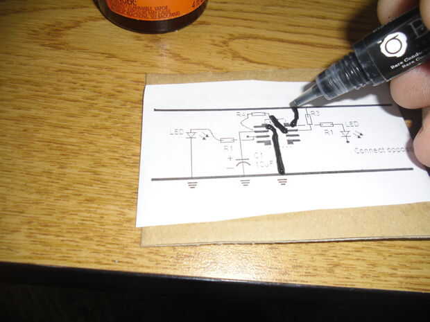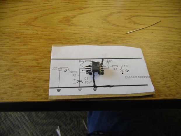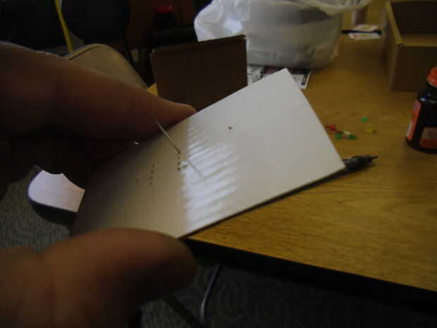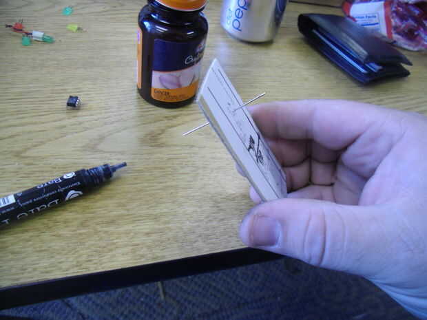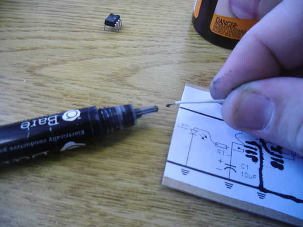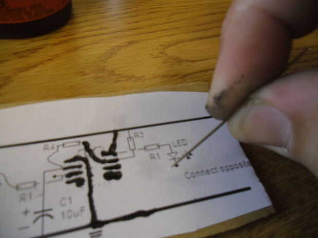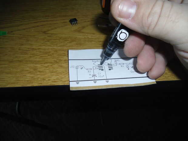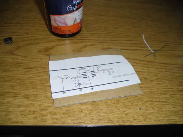 Imprimir el circuito rastro guía y corte al tamaño de una tarjeta de crédito. Coloque en el soporte de cartón, luego empezar a trazar las 8 salidas principales de la viruta del IC 555 temporizador con pintura desnudos. Hay 3 cables que se conectan bajo el chip, por lo que crea con pintura desnudo (cuidado aquí). Acabado de las huellas principales como se muestra, utilizando un alambre o una aguja para ser más precisos con la pintura. Tener cuidado para asegurar que las conexiones no tocan donde no desea que el circuito fuera corto. Utilizando una aguja, perfore los 8 agujeros en la ranura de IC donde se inserta el chip, así como cualquier lugar donde usted necesitará insertar LEDs, resistencias y condensadores. Puede utilizar la aguja o push pin para ensanchar los orificios más tarde según sea necesario. Inserte el chip 555 en la placa de circuito de cartón.