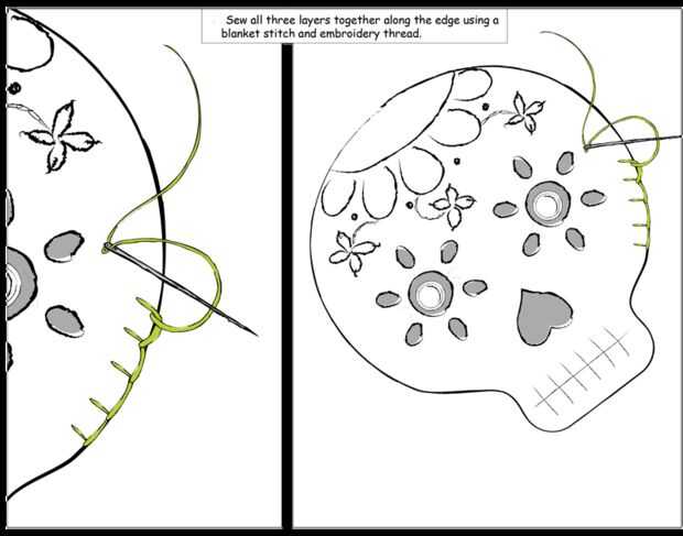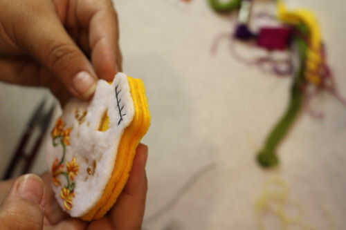 Tomar el frente decorado y colóquelo sobre las dos capas superiores. Coser las tres capas juntas a lo largo de los bordes utilizando un hilo de bordado y ribete.