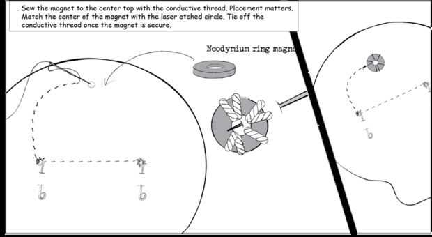 Coser el imán en la parte superior del centro con el hilo conductor. La colocación es importante. Coincidir con el centro del imán con el círculo en el patrón. Ate el hilo conductor una vez que el imán es seguro.