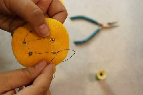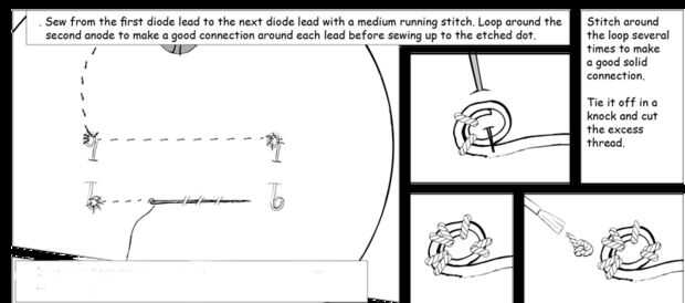 Cosa de la primera ventaja del diodo al siguiente conductor diodo con un medio punto de funcionamiento. Lazo alrededor del segundo ánodo para hacer una buena conexión alrededor de cada conductor antes de coser hasta el punto de grabado al agua fuerte. Coser alrededor del bucle varias veces para hacer una buena conexión sólida.