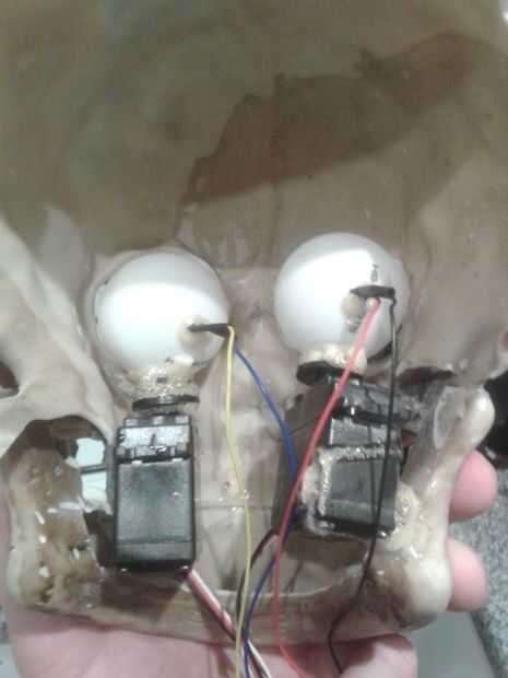 Poner los ojos ahora establecidos en los ejes de los servos y les ofrecen hasta los agujeros para los ojos en el cráneo. Marque la ubicación de los servos, así que los ojos son como punto muerto como usted puede conseguirlos. Utilicé lápiz de cera ya que es muy bueno y fácilmente desprendible. Quite los globos oculares y pegue los servos en el cráneo. Me gusta epoxy para éstos pero sugiero pegar uno por uno y apriete hasta que se seque. Nota Asegúrese de que el pegamento no Haz colocado en la abrazadera. Tuvo que fijar bodge, uno de los servos con pegamento del gorila como para pegar a la abrazadera en lugar de la calavera. Uy.