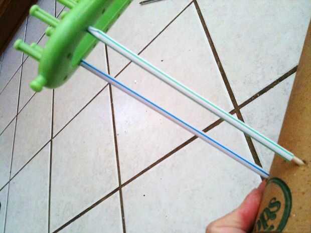 • Tomar los pinchos y lugar ellos dentro el correo tubos recién perforados agujeros. A continuación tome su telar y alinearse con sus pinchos. (Utilizar los orificios telar debajo de la parte superior dos para mis pinchos. Me imaginé que sería más estable entonces usando los dos agujeros). Coloque los pinchos en telar y mirar cómo loco parece hasta ahora. Se verá mejor cuando haya terminado.