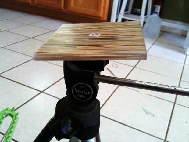• Hacer un agujero en el centro de su Velcro y adherir Velcro dijo a dicho trípode asegurándose de que el agujero en la cinta de Velcro está centrado sobre el tornillo. Lo mismo a su 4 "X 4" pieza de madera y plástico. Juntar las dos piezas de Velcro y que conocer uno al otro durante un tiempo. Poco tiempo solo si sabes lo que quiero decir... y si sabes lo que quiero decir entonces te son un poco de una tuerca y deben recibir un tratamiento demasiado! Hahaa. (Mi 4 "X 4" es una muestra de algún tipo de mala hierba hierba de acrílico que encontré en la tienda. Lo compró y lo utilizó como una montaña pero no funciona tan bien debido a la condensación que goteaba de mi bebida helada recogidos en la quieres montaña y derramado sobre el lado para hacer un gran lío cuadrado Aguado en mi "antiguo" thrift almacenar mesa fuera. Casi un círculo de corcho ha añadido a la montaña de la montaña no pero decidió que ya tenía bastante funky posavasos estilo ' libres y podría utilizar esto para otra cosa. Bueno lo hice porque ahora es el mejor correo electrónico tubo titular cosa-un-majig nunca!)