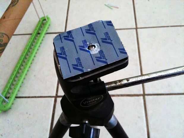 • Corte el Velcro a las mismas dimensiones que la cabeza del trípode. Va a utilizar una perforadora si sólo utiliza una sola pieza grande. Si usted quiere cortar cuatro trocitos supongo que podría renunciar el sacador de agujero.