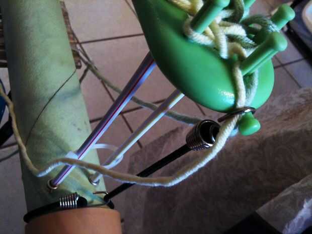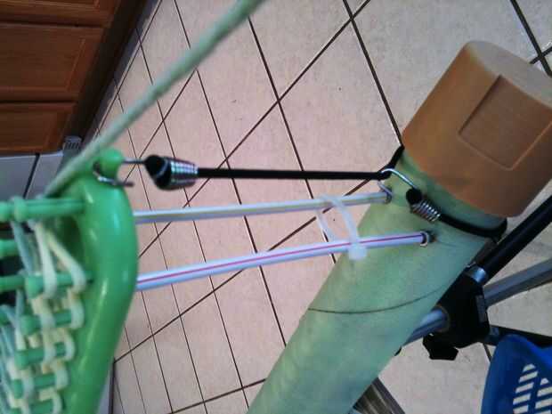 • Las cuerdas de amortiguador auxiliar son fáciles de usar, una vez que el cuelgue de ella. Envuelva un extremo de la cuerda del amortiguador auxiliar alrededor de un extremo del tubo un correo electrónico. Asegure que la clavija de la cabeza de su telar como se muestra en las fotos. Esto es un poco prolijas para que me lo describa por favor mira la foto y haga cualquier pregunta que tenga. (Yo uso el amortiguador auxiliar que está conectado a la clavija de la cabeza de mi telar para sostener que mi hilo está parado mientras estoy ausente. También he añadido los clips de papel para ello.)