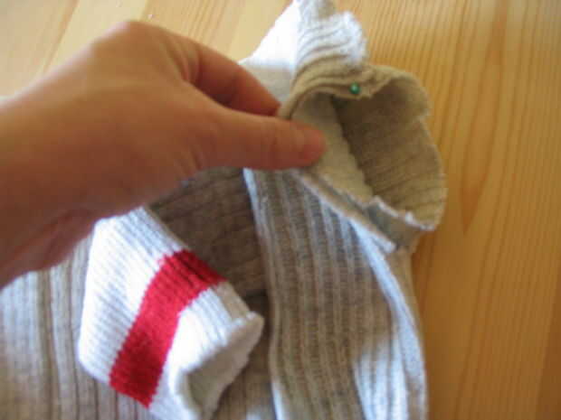 Gire la parte superior del cuerpo de adentro hacia afuera, luego meter el calcetín 'manga' (lado derecho hacia fuera) en el agujero del brazo y poner un pasador en el hombro para que no vayas askew. Yo no soy un gran fan de los pernos, pero siempre es bueno usar uno aquí y allá. Coser alrededor de la sisa, hacer esto en ambos lados, luego girar a la derecha hacia fuera y disfrutar de tu trabajo. Está empezando a unirse!