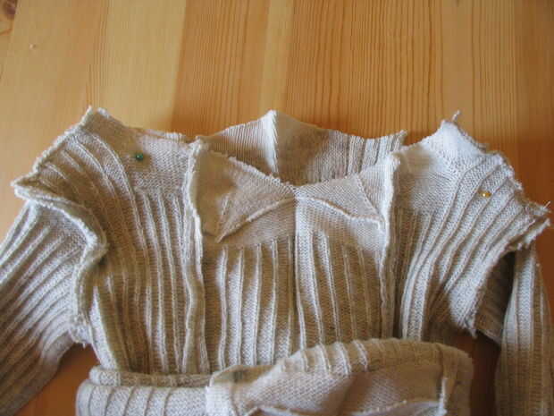 Ordenado por las costuras de hombros y zona del cuello. Minas fueron abiertas y demasiado grande, así que les un poco. Aún se conserva el collar lo suficientemente grande como para que él ponga su cabeza a través de. Una vez que cose alrededor de él, es no tan elástica, por lo que no vaya por la borda aquí, o usted va ser sacar tus puntadas. :(