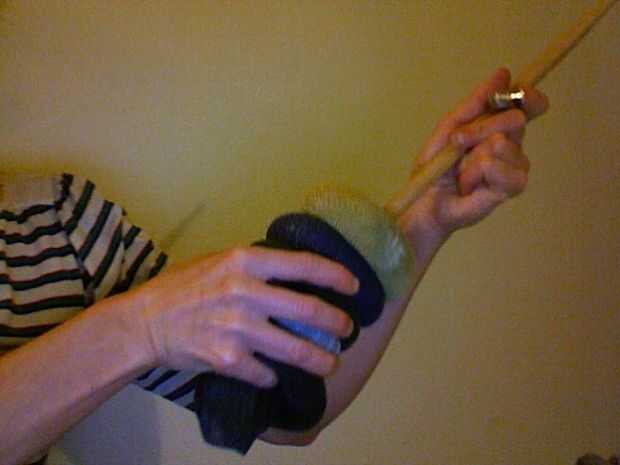 Hacen varios calcetín donuts dependiendo de la longitud deseada de la corona e insertarlos en uno al otro con algo largo y delgado como un palillo.