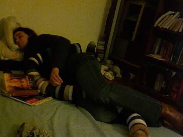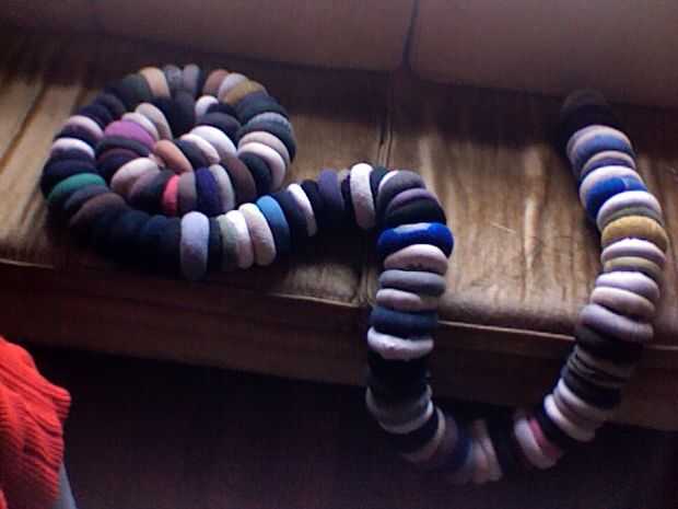 Continuar agregando calcetines hasta que haya alcanzado la longitud deseada. Los calcetines se pueden dejar en esta forma y utilizados como soporte para una postura correcta durante el sueño.