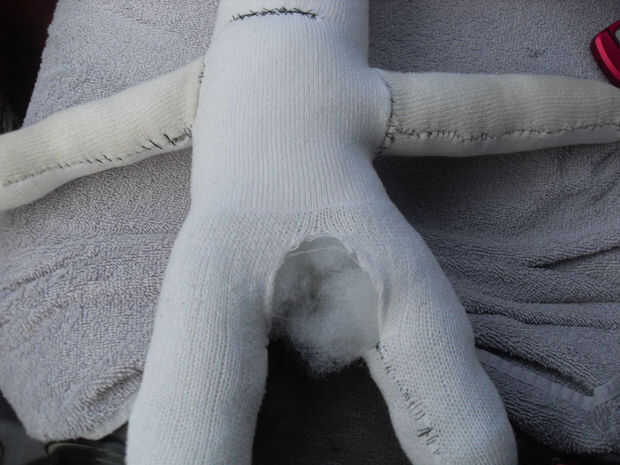 encontrar un calcetíncortado al tamaño adecuadocoser en los ojos de botóncortar franjas de calcetín para los brazos y coserloscoser una línea de hilo rojo para la bocacostura en hilo colgando en la cabeza para el pelohacer ropa (opcional) como se ve