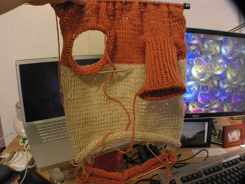 Empezar a tejer unas filas hasta que el borde frontal del portátil. Ahora es el momento de añadir las mangas (Recuerde que las manos de su ordenador portátil en un ángulo pronunciado, no hacia arriba). Determinar cómo amplia sus mangas serán y contar bastantes puntadas que centrada en el borde frontal del portátil. Punto a este marcador, luego coloque el número del manga de puntadas en un portador, lugar del divisor puntadas en otro titular, y luego hacer lo mismo otra vez con puntadas de la manga siguiente, después de punto para terminar. Punto diez filas para arriba en los laterales y la sección de divisor antes de emitir invisiblemente en el mismo número de puntos que estén en el manga. Ahora tienes dos agujeros cuadrados en una pieza rectangular de lo contrario. Recoger los puntos de soporte, recoger puntos de sutura en el lado del agujero, recoger el molde invisiblemente en puntadas, luego recoger más puntos a lo largo del otro lado del agujero, usando agujas de punta doble. Knit en K1, costilla P1 para como quieres que su manga sea. Repita para la otra manga.