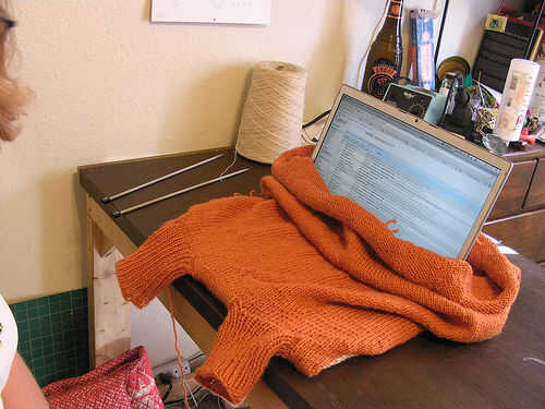 Una vez que has llegado a la parte superior de la pantalla, recoger puntos de sutura en los bordes de la pantalla y Únete a ellos en agujas circulares con los de la parte superior de la pantalla y la parte superior del teclado. Punto en el redondo para unas pocas líneas. Luego empezar a disminuir. Tenía 242 puntos, así que disminuí cada 22 puntadas, puntadas para 11 menos en la siguiente fila. Utilice cualquier trabajo números para su total (incluso divisibilidad). Sólo disminuir cada fila una fila simple de tejer en el medio. En la siguiente fila, disminuir con una puntada menos entre disminuye, en mi caso 21. Tejer una fila simple, luego repetir el proceso pasado, contar hasta 20, luego 19, etc.. Hasta que la campana el tamaño que desee, me tomó cerca de 30 filas. Punto en la ronda hasta que la campana es lo suficientemente larga para llegar cómodamente a la cara cuando sentado en una posición natural.