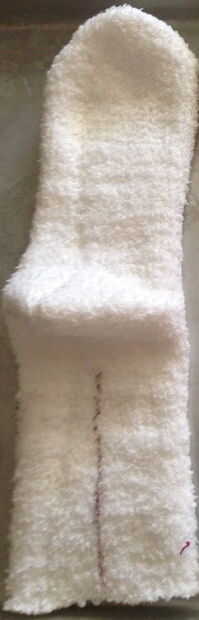 • Alrededor de los pies con sus tijeras y luego coser los lados de las piernas, dejando un espacio para que usted puede puede voltear el calcetín derecho lado hacia afuera.