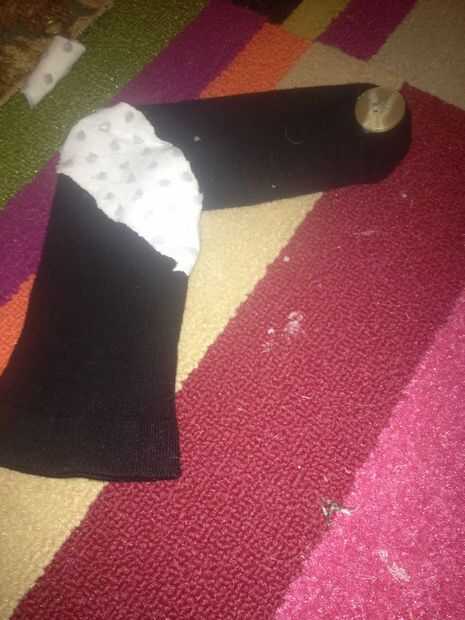 Este es un perro que hice hace años, con mi madre. Él hizo de calcetines gris y blancos y un calcetín entero para su cuerpo. Sus ojos y nariz son botones. ¿No es lindo?