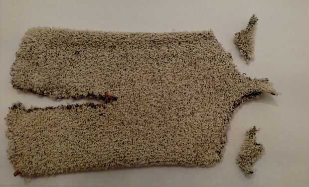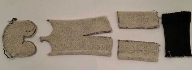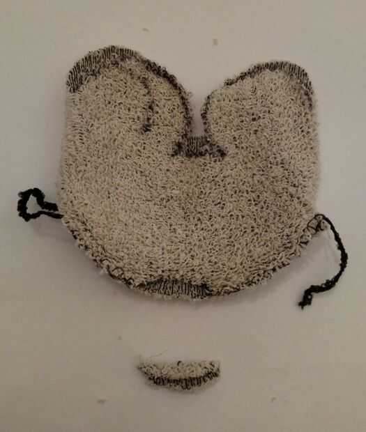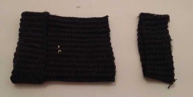 Cortar aproximadamente una pulgada desde la parte inferior del manguito. Esta parte se utilizará para hacer un parche de hocico en la cara. Cortar un óvalo pequeño de este material. Sólo lo suficientemente grande para cubrir aproximadamente la mitad de la cara.