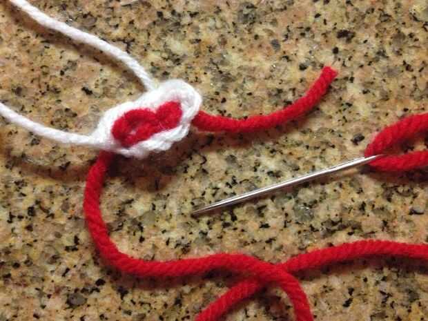 Coser el hilo rojo en el medio de boca.