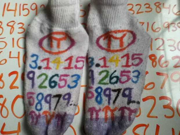 Tomar los calcetines y el símbolo de pi en la parte superior o inferior, en la parte frontal de la pintura. A continuación la pintura en el principio de pi, o tantos como quiere o puede caber en el calcetín. Repetir este proceso en el otro calcetín.