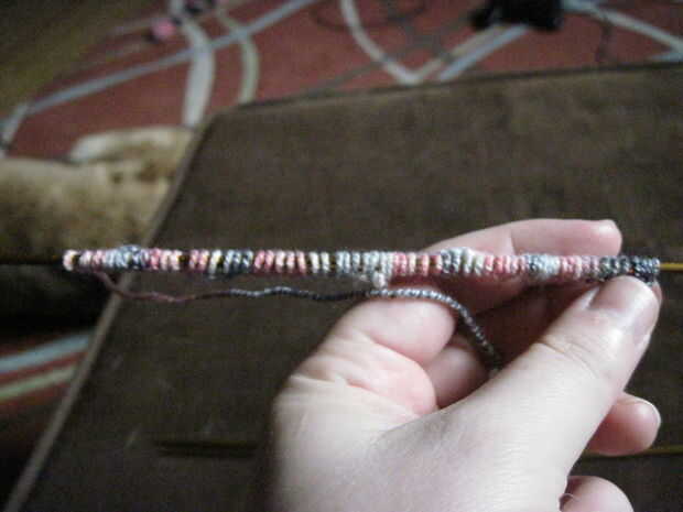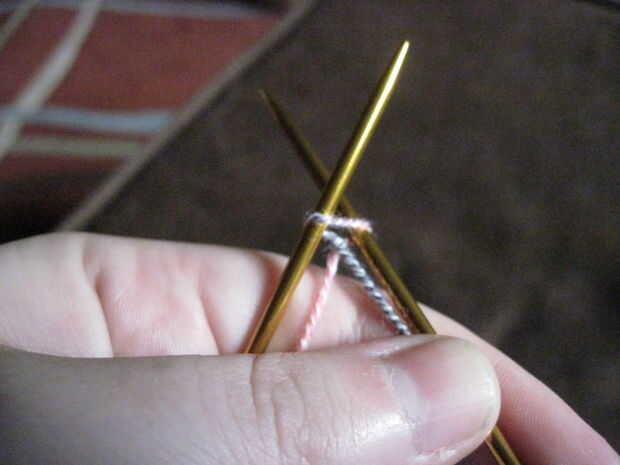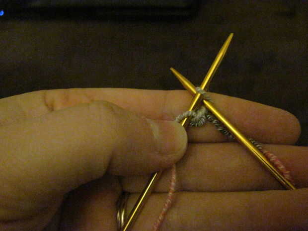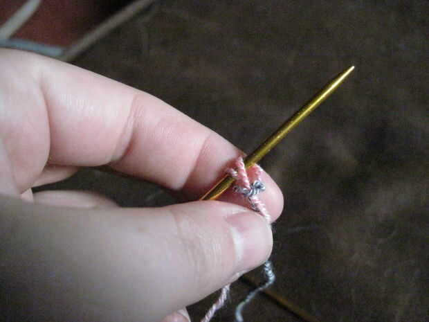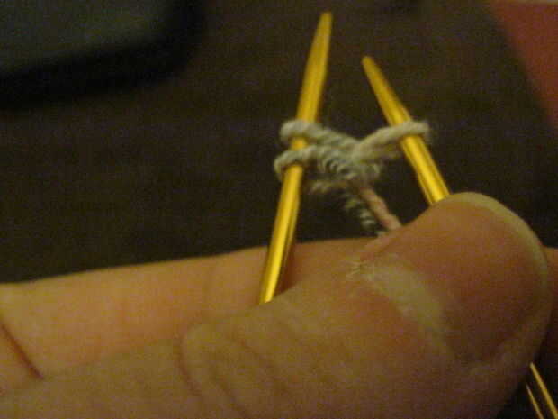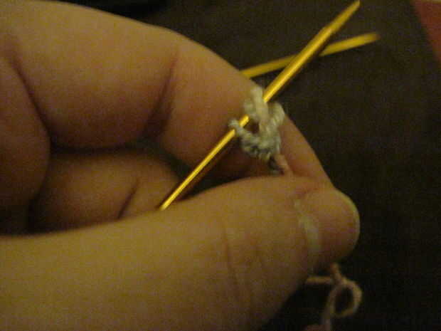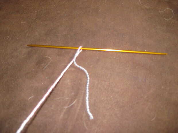 A continuación inserte la aguja entre los dos puntos en tu aguja, enrolle el hilo sobre la aguja, dibujar a través del espacio y colocarlo en la aguja al lado de los otros dos. Continúe de esta manera usted tiene 64 puntos en la aguja.
