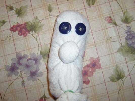 Tomar una aguja y vio los 2 botones en el calcetín.
