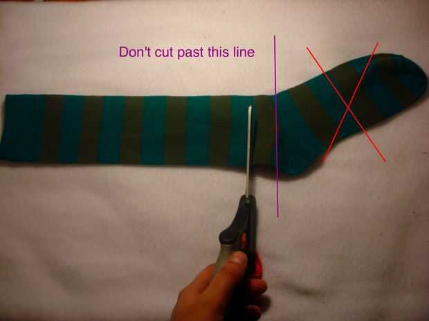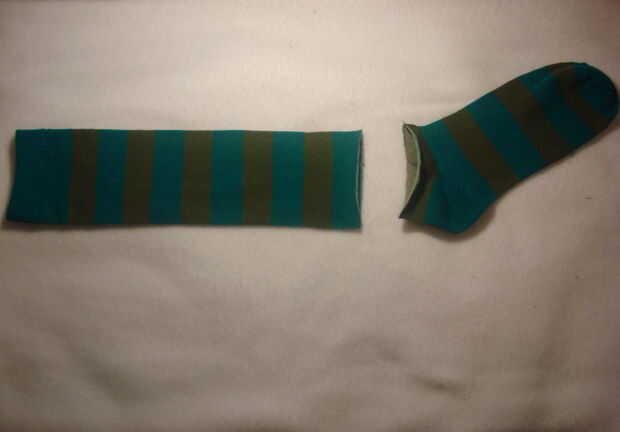 La corte parte del calcetín ahora será la parte inferior en el guante sin dedos. Me gustaría mantener esta parte cruda sin ninguna costura.