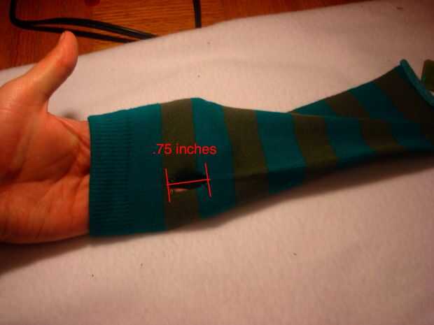 una amiga envió un par de medias de la rodilla y me preguntó uso a hacer un par de guantes sin dedos. La imagen que envió de su visión mostró un pulgar pedazo (a diferencia de un agujero del pulgar), así que me senté a averiguar cómo hacer para crear