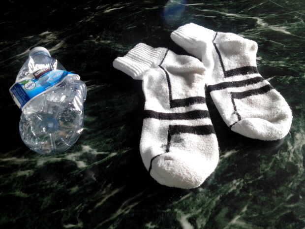 todo lo que necesitas son algunos viejos calcetines apestosos y una botella de agua arrugada. Recomiendo más gruesos calcetines cortos de espesor mediano. Son mejor para tugawar y el juego, así como la masticación.