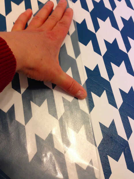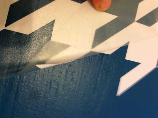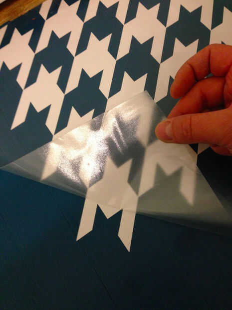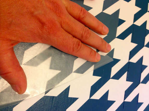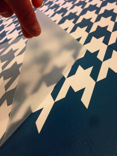 Medida cuadrado y empezar a poner etiquetas. Utilice el squegee para frotar las calcomanías sobre el suelo para conseguir que pegar. Si elegiste bien la combinación de cinta de vinilo o transferir, la cinta de la transferencia debe salir bastante fácilmente, dejando que las calcomanías se adhieren al piso. Tuve la suerte mejor despegando la cinta de transferencia en un ángulo de 180 º desde el suelo. Algunas de las "patas" de la pata de gallo querían pelar encima. Si eso sucede, pegue la cinta de transferencia hacia abajo y otra vez la escobilla de goma.