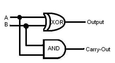 La puerta XOR es exclusiva para o. En una regular o puerta, 0 y 0 igual 0, 1 y 1 iguales 0, 1 y 1 igualan a 1. En una exclusiva o puerta, 0 y 0 igual 0, 1 y 1 iguales 0, 1 y 1 igualan a 0. Esto es importante porque al agregar 1 y 1 en binario que se obtiene 10, por lo que el lugar tiene un cero, algo que no se puede hacer con una base o puerta.