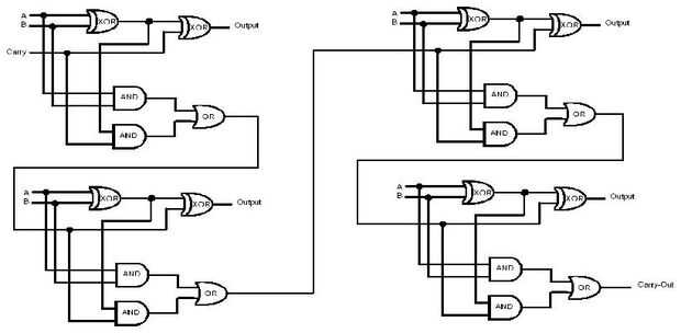 Ahora que ya tenemos serpientes completos, es hora de ponerlos juntos para hacer una calculadora. Para conectar todas las serpientes juntos, tienes que conectar las salidas de llevar para llevar-ins en una moda en cascada. Para que la realizar de la víbora primera conecta al llevar de la víbora segunda y así sucesivamente.