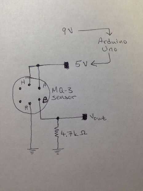 Con el fin de obtener un 5V de la fuente (ya que el MQ-3 funciona con 5V), usamos el arduino uno como ha construido en 9V a 5V del convertidor.