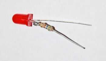 La tercera imagen muestra una resistencia soldada a un LED. Esto es opcional, pero he encontrado que el tener un montón de estos hechos hace breadboarding mucho más fácil. Solde un resistor al plomo del cátodo de algunos LEDs. El cátodo es el cable negativo (tierra) más corto.