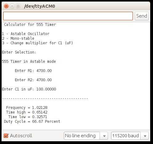 En todas las versiones del programa primero se le pedirá que circuito para correr, entonces se le pedirá los valores de resistor y capacitor. Cuando los valores de R/C completados mostrará los tiempos que estos valores se producen en un circuito 555 temporizador.