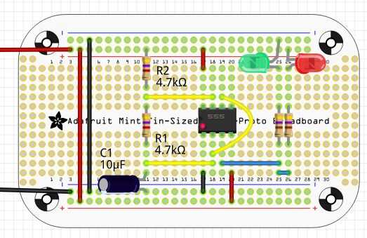 El LED verde indica que el pin de salida de la 555 es alta, y rojo indica baja.